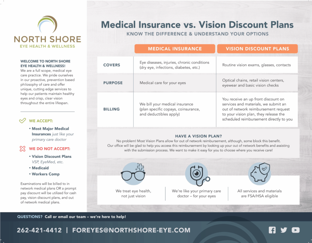 North Shore Eye is a medical eye care clinic, which means we bill through your medical insurance, not vision plans. This allows us to prioritize your eye health and provide comprehensive care for medical eye conditions, rather than limiting services to basic vision benefits.